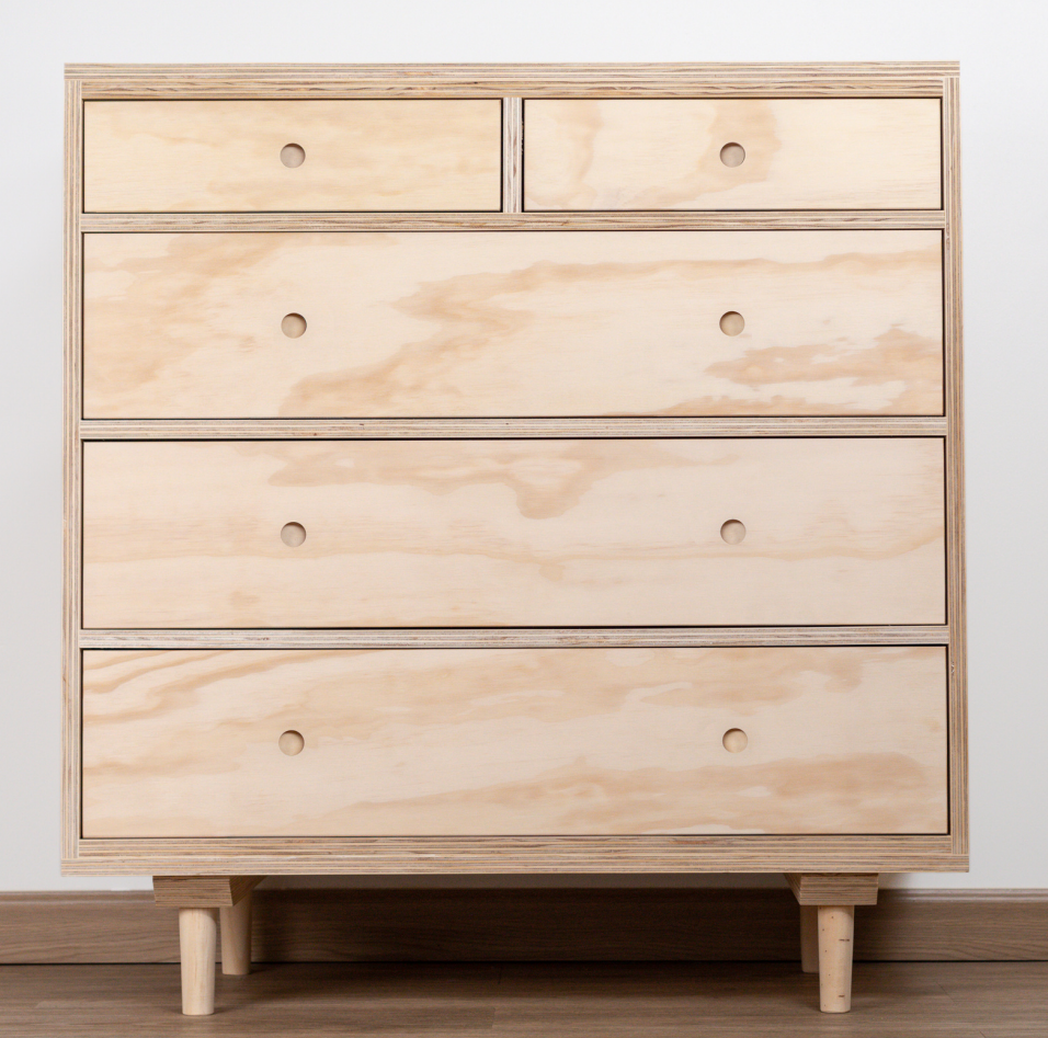 Cómoda de terciado personalizable. Ajusta su ancho y profundidad para adaptarla a tu espacio. Diseño limpio, funcional y natural que combina con todo.
